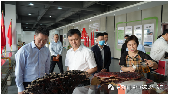 陳副省長(zhǎng)一行來(lái)到產(chǎn)品展示區(qū)進(jìn)行參觀,了解了公司種植、經(jīng)營(yíng)模式、產(chǎn)業(yè)發(fā)展規(guī)模、產(chǎn)品銷售及經(jīng)濟(jì)效益等情況。井岡山市益生緣靈芝生態(tài)園董事長(zhǎng)劉鋮作了詳細(xì)的匯報(bào)。井岡山益生緣靈芝生態(tài)園有限公司于2014年落戶井岡山市拿山鎮(zhèn)勝利村。目前已建成包含有野生靈芝菌種研發(fā)、馴化、培育、靈芝菌椴生產(chǎn)、種植、產(chǎn)品研發(fā)、產(chǎn)品銷售、旅游功能為一體的高科技觀光和江西省農(nóng)業(yè)龍頭企業(yè)。